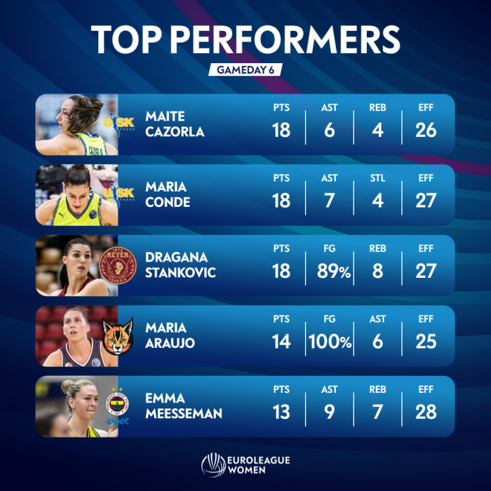 La pívot Emma Meesseman del Fenerbahce Opet ha sido designada como la mejor jugadora de la 6ª Jornada de la Primera Fase de la Liga Regular de la Euroliga Femenina 2024-25 por los 28 puntos de valoración obtenidos en la victoria de su equipo (90-61) ante el KGHM BC Polkowice. Meesseman terminó el encuentro con 13 puntos, 9 asistencias, 7 rebotes y 4 robos de balón para las ya mencionados 28 puntos de valoración que la hacen merecedora de esta distinción.